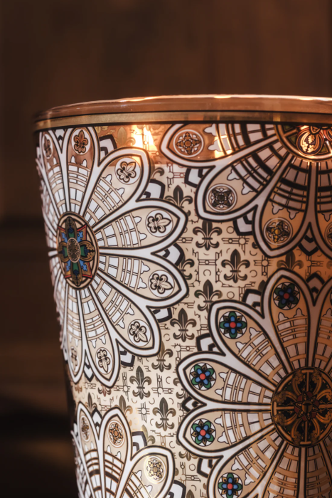 La bougie Rosace rend hommage à l’architecture gothique et à la lumière spirituelle des cathédrales. Son verre est recouvert d’une sérigraphie précieuse, où l’or et les couleurs subtiles dessinent des motifs inspirés des rosaces médiévales. Comme une dentelle lumineuse, ce décor raffiné se révèle sur un fond de fleurs de lys, emblème de noblesse et de pureté.