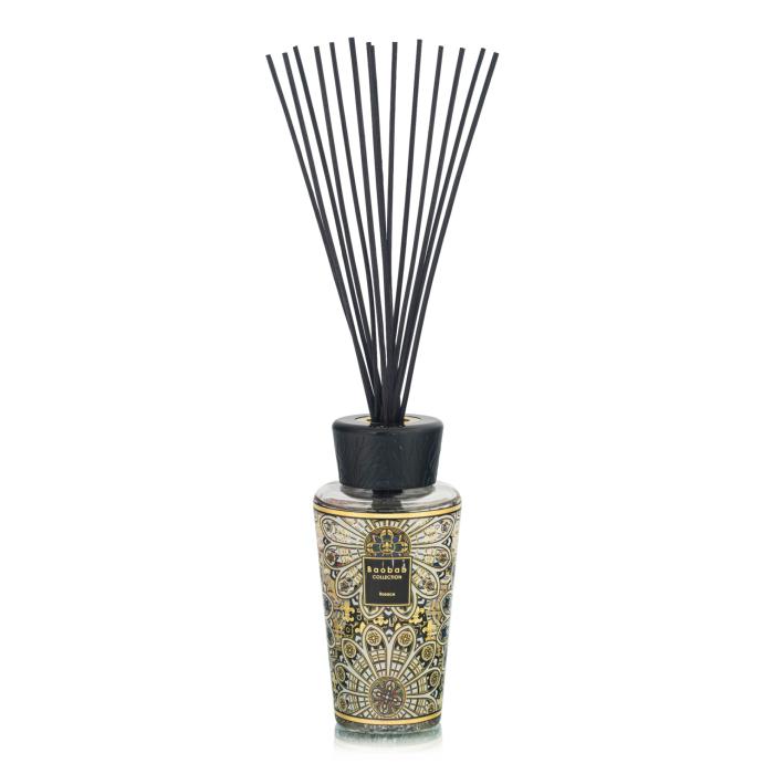 Le diffuseur Rosace s’inspire de l’architecture gothique et des vitraux majestueux de cathédrales. Son verre est habillé d’une sérigraphie en or 24 carats, reprenant les motifs géométriques des rosaces médiévales, délicatement dessinés sur un fond de fleurs de lys, symbole de noblesse et de pureté. Objet décoratif raffiné, il parfume l’espace avec élégance et prolonge l’univers enchanteur de la collection Rosace tout au long de la saison.