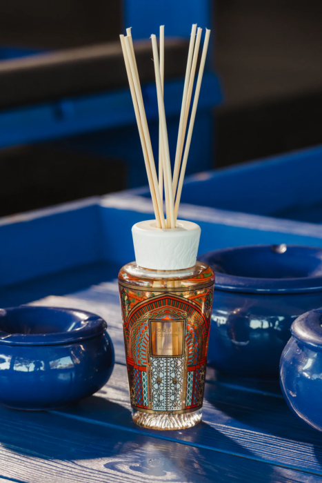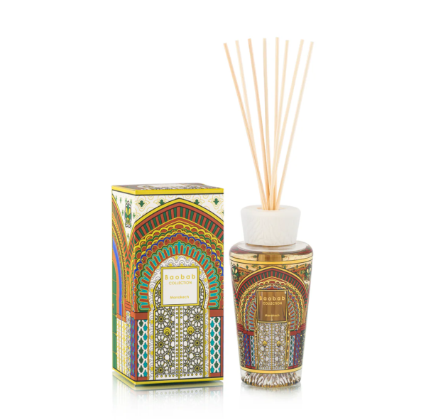 Élégant et raffiné, le diffuseur My First Baobab Marrakech reprend le décor emblématique des portes de la médina dans une interprétation inspirée de l’artisanat local. La fleur d’oranger, dominante, se mêle aux notes cuirées des tanneries et au patchouli des marchés, pour un parfum d’intérieur évocateur et envoûtant.